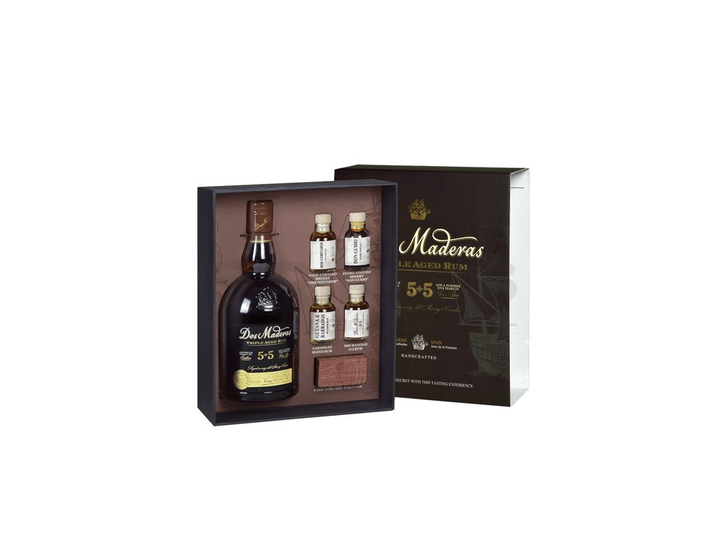 V darčekovom balení získate vzorky sherry a kus dreva zo suda. Tiež v boxe nájdete aj brožurku s detailnými informáciami o chuťovom profilu každej priloženej vzorky s vysvetlením, ako probieha stárnutie systémom solera a s popisom výroby unikátneho rumu Dos Maderas P.X. 5+5 krok za krokom a nechýba ani pár tipov na miešané nápoje.